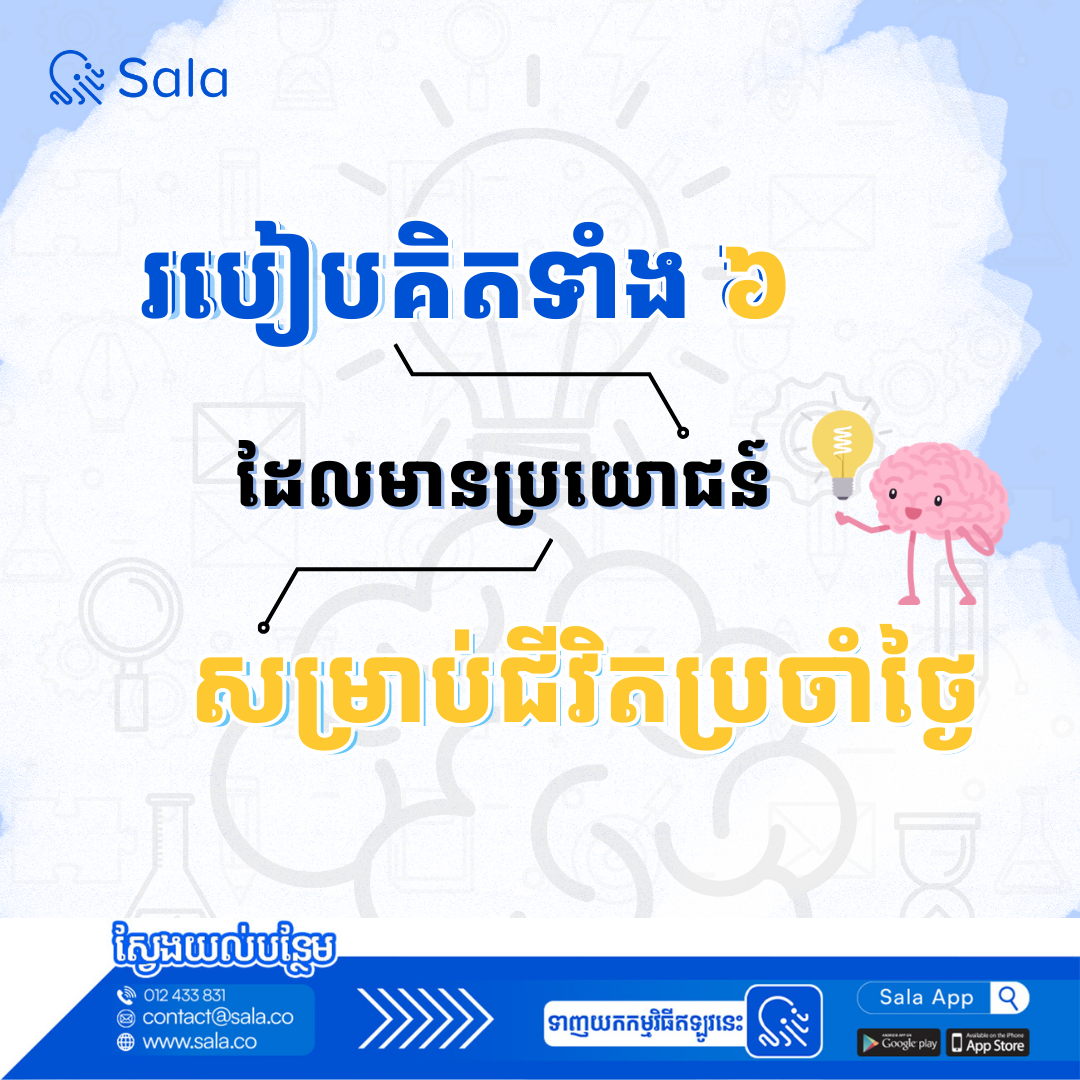 ការគិតមានឥទ្ធិពលខ្លាំងណាស់ទៅលើជីវិតរស់នៅប្រចាំថ្ងៃរបស់យើង។ ផ្នត់គំនិតមួយដែលល្អត្រឹមត្រូវនឹងនាំយើងឱ្យដើរលើវិថីមួយដ៏ត្រឹមត្រូវ។ ការគិតរបស់មនុស្សម្នាក់ៗមានភាពខុសៗគ្នាទៅតាមចំណេះដឹង និងបទពិសោធន៍ដែលពួកគេបានឆ្លងកាត់រៀងៗខ្លួន។ ខាងក្រោមនេះ គឺជារបៀបគិតទាំង ៦ ដែល Sala គិតថាអាចមានប្រយោជន៍សម្រាប់ជីវិតរស់នៅប្រចាំថ្ងៃរបស់អ្នកទាំងអស់គ្នា។